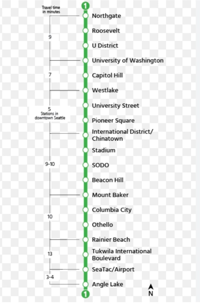 The first train that arrived at the platform was labeled “Angle Lake,” which meant it was heading south, away from our destination. We waited for the next train, which was labeled “Northgate.” This train was going north, and though Northgate wasn’t our final stop, it would take us in the right direction. We rode it for 12 stops and arrived at our destination, Westlake.